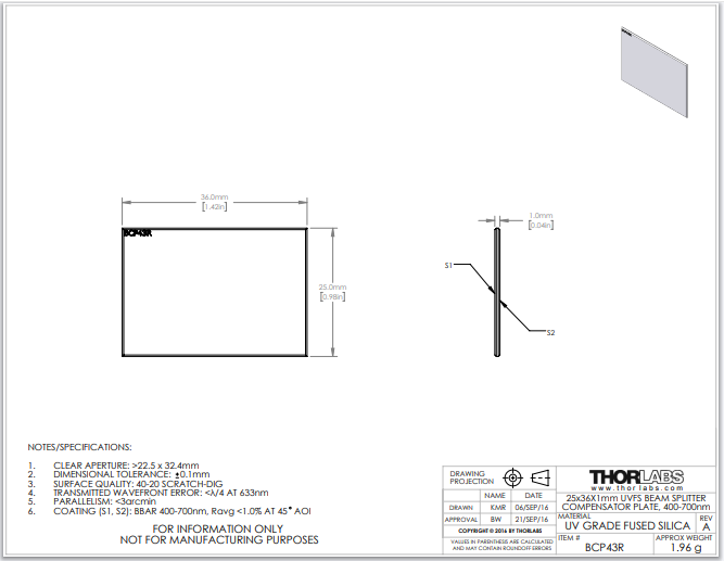 Thorlabs索雷博 BCP43R - 紫外熔融分束镜补偿片