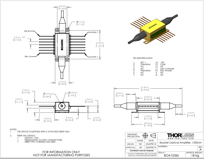 Thorlabs索雷博 BOA1036S - O波段助推光学放大器