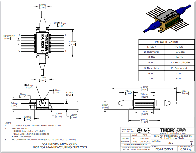 Thorlabs索雷博 BOA1550PXS - 1550 nm偏振相关光学快门/开关