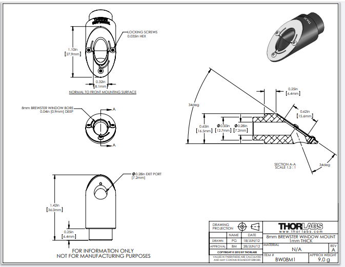Thorlabs索雷博     BW08M1 - 布儒斯特窗口片安装座