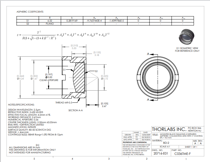 Thorlabs索雷博     C036TME-F   非球面透镜