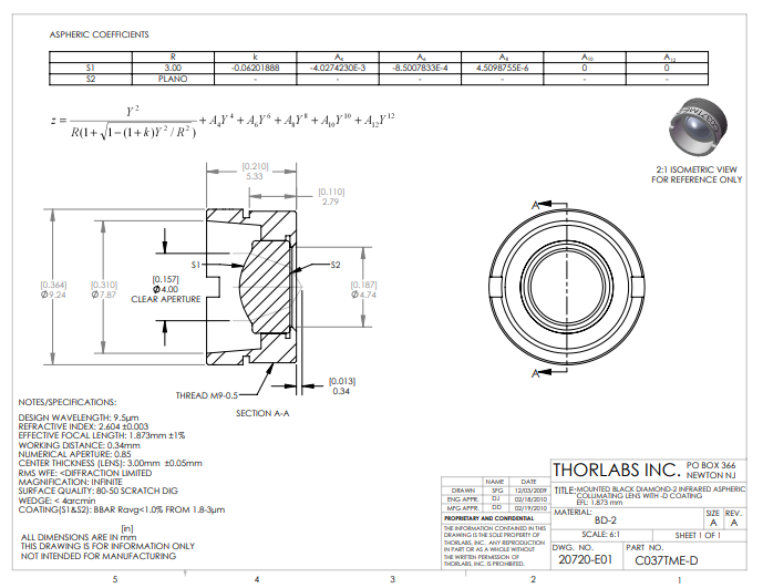 Thorlabs索雷博     C037TME-D   非球面透镜