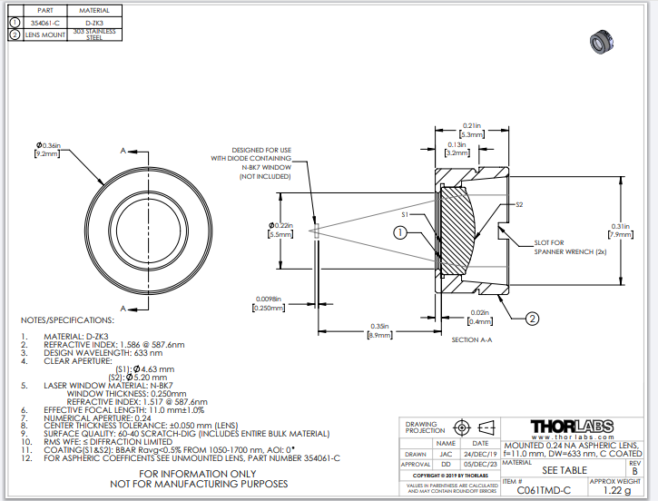Thorlabs索雷博 C061TMD-C 非球面透镜