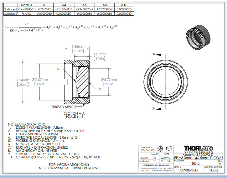 Thorlabs索雷博     C093TME-D   非球面透镜