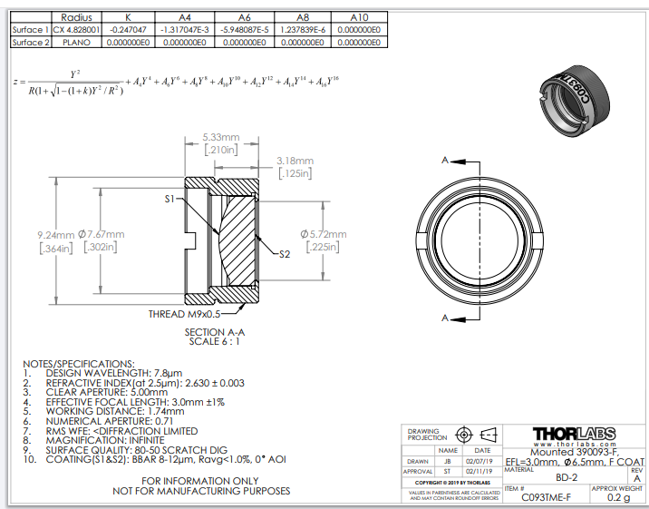 Thorlabs索雷博 C093TME-F 非球面透镜