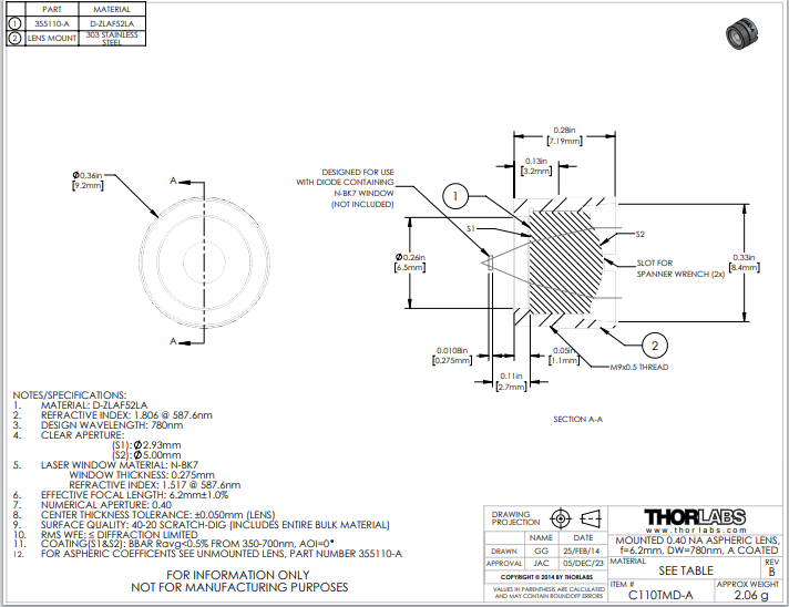 Thorlabs索雷博 C110TMD-A 非球面透镜