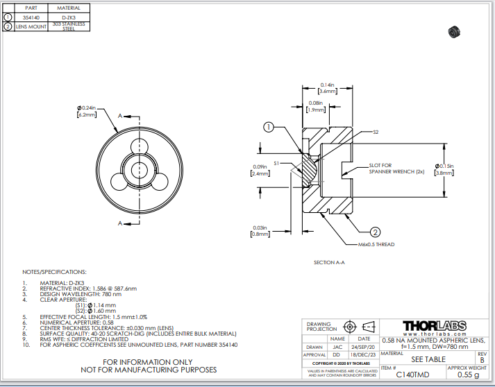 Thorlabs索雷博 C140TMD 非球面透镜