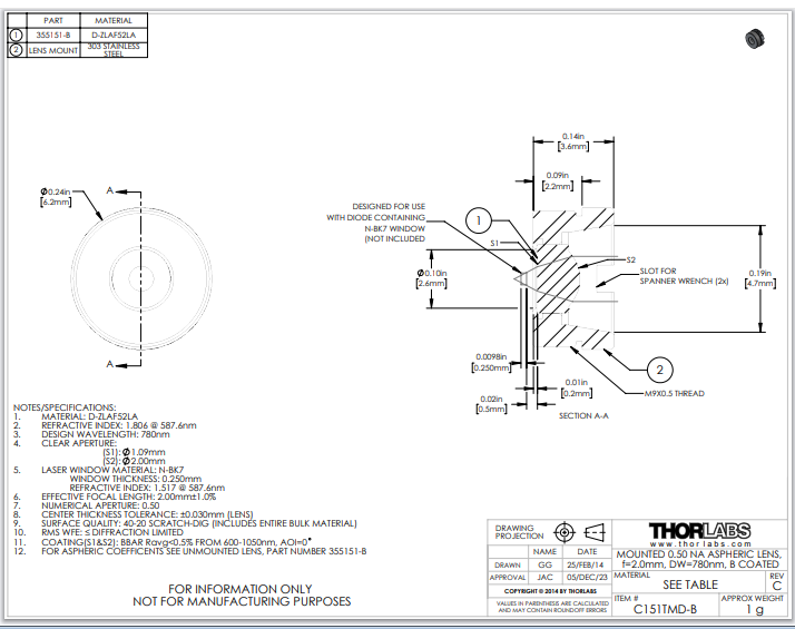 Thorlabs索雷博 C151TMD-B 非球面透镜