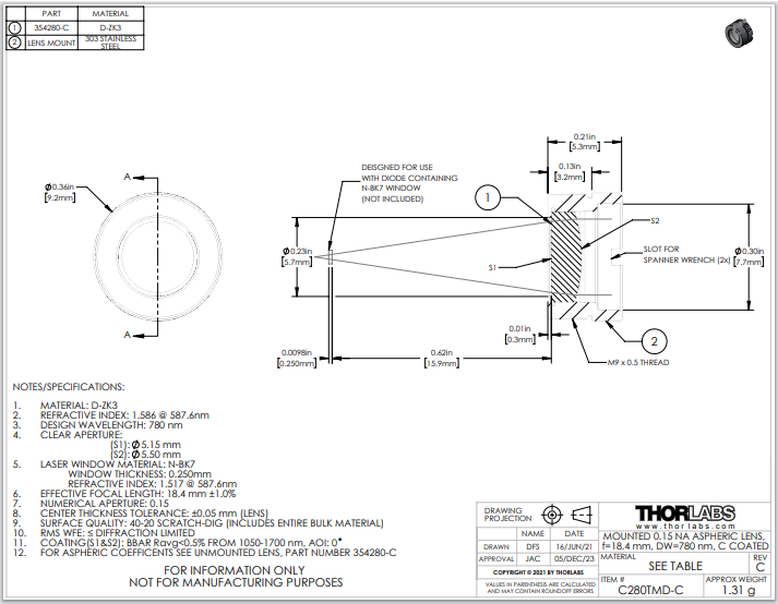 Thorlabs索雷博 C280TMD-C 非球面透镜