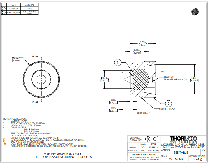 Thorlabs索雷博 C350TMD-B 非球面透镜