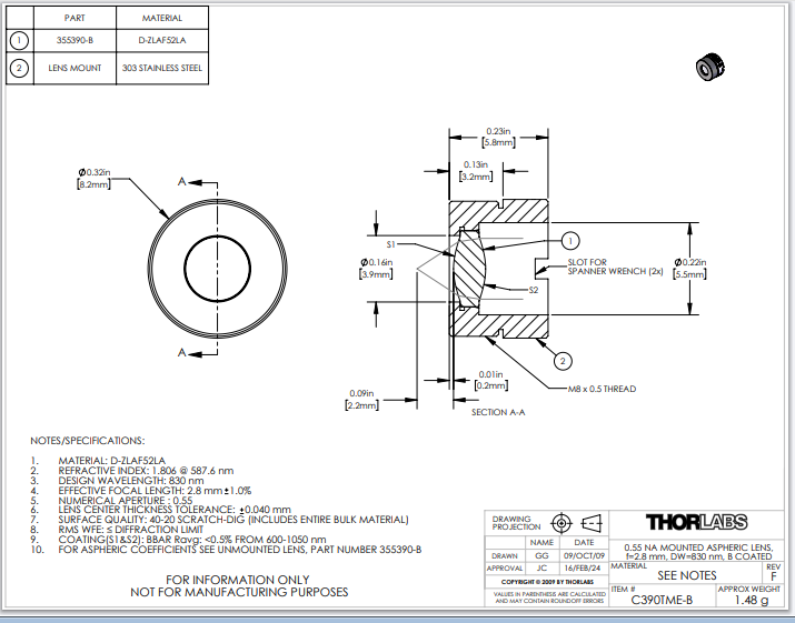 Thorlabs索雷博 C390TME-B 非球面透镜