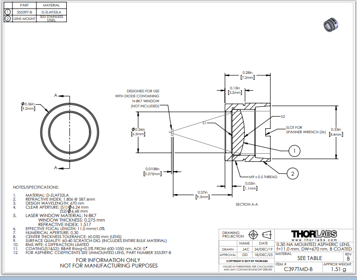 Thorlabs索雷博 C397TMD-B 非球面透镜