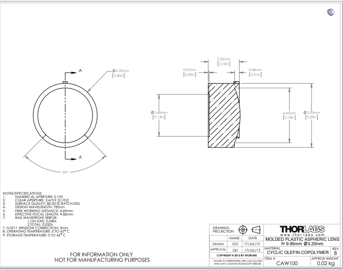 Thorlabs索雷博 CAW100 塑料非球面透镜