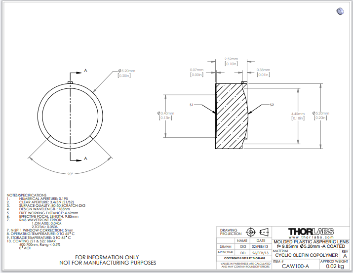 Thorlabs索雷博 CAW100-A 非球面透镜