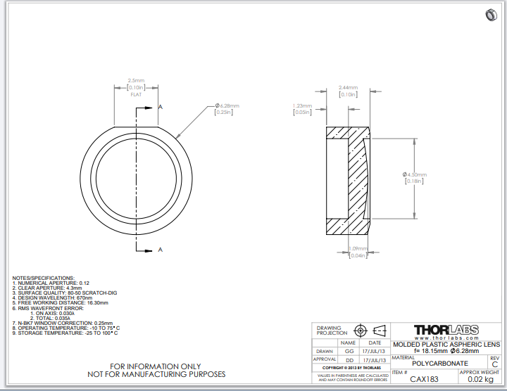 Thorlabs索雷博 CAX183-25 塑料非球面透镜