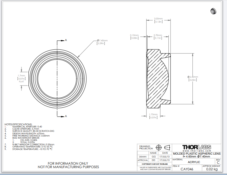 Thorlabs索雷博     CAY046   塑料非球面透镜