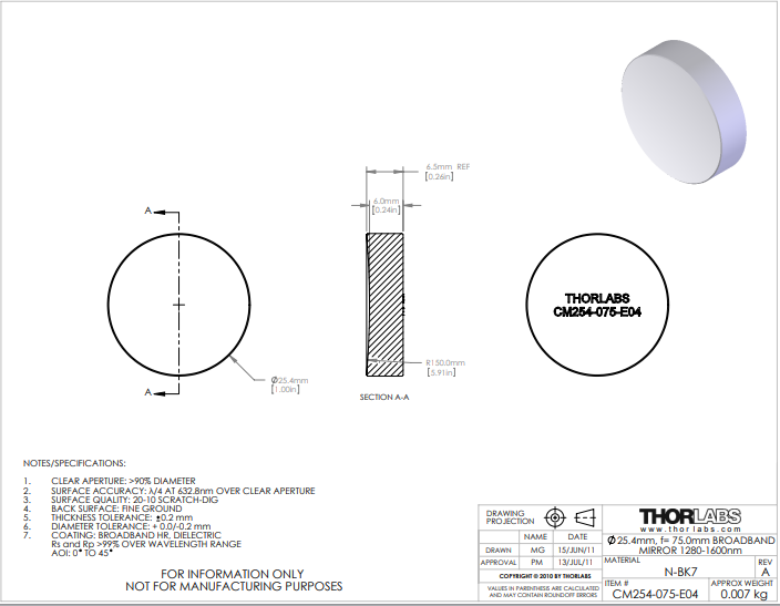 Thorlabs索雷博 CM254-075-E04 Ø1英寸介质膜凹面反射镜