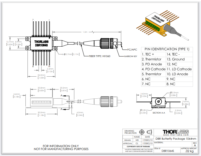 Thorlabs索雷博 DBR1064S - 分布式布拉格反射激光器