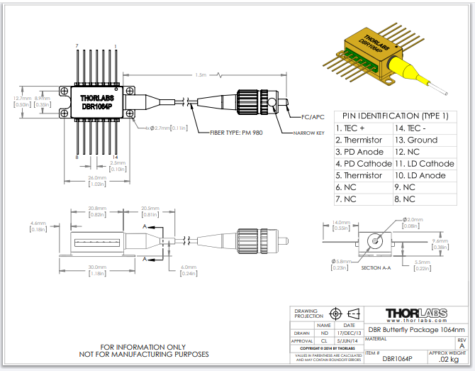 Thorlabs索雷博     DBR1064P - 分布式布拉格反射激光器
