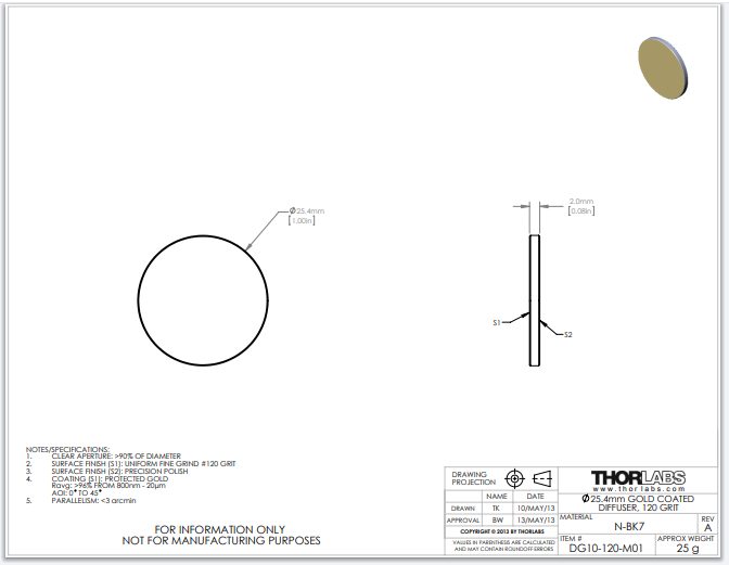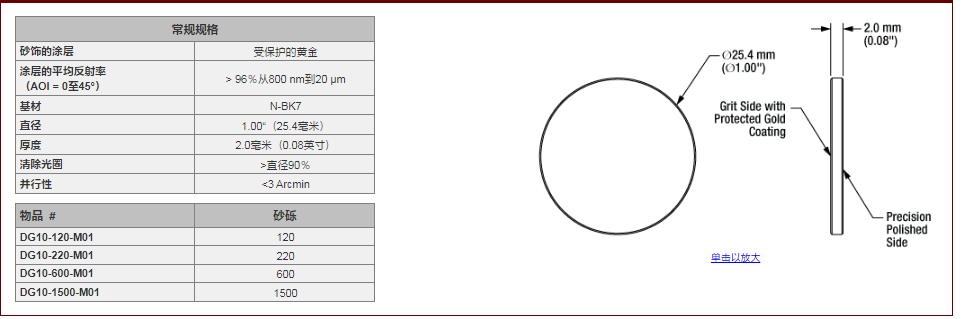 Thorlabs索雷博 DG10-120-M01 - Ø1英寸有保护层的金膜玻璃漫反射镜