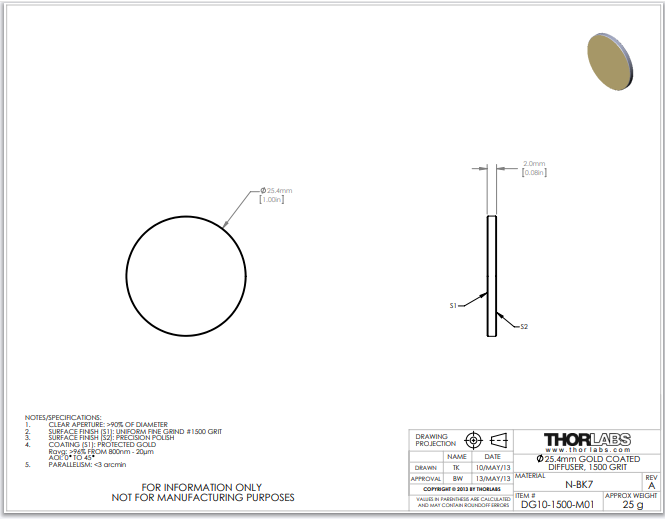 Thorlabs索雷博 DG10-1500-M01 - Ø1英寸有保护层的金膜玻璃漫反射镜