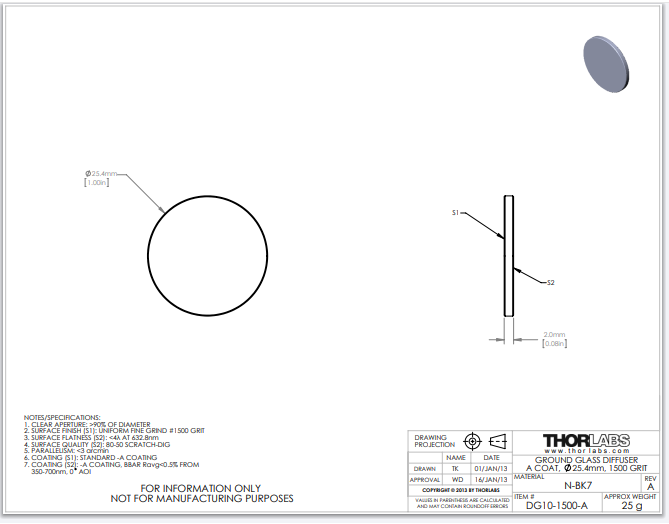Thorlabs索雷博 DG10-1500-A - Ø1英寸N-BK7磨砂玻璃散射片
