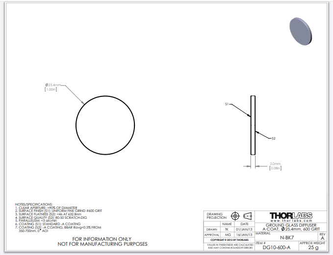 Thorlabs索雷博 DG10-600-A - Ø1英寸N-BK7磨砂玻璃散射片