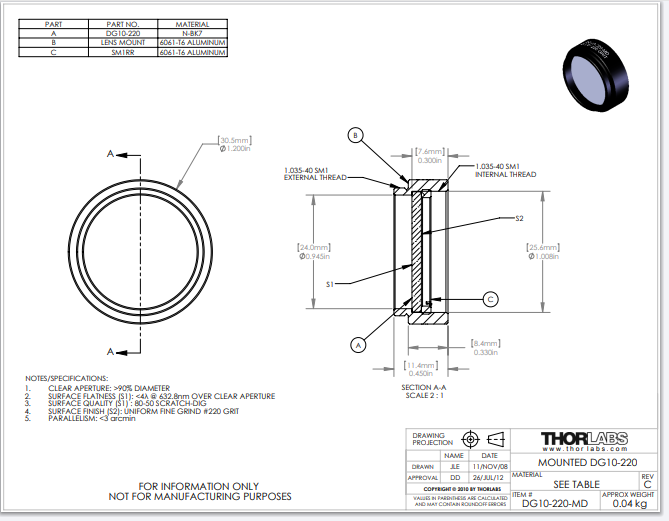 Thorlabs索雷博 DG10-220-MD - Ø1英寸,SM1螺纹安装,N-BK7磨砂玻璃散射片