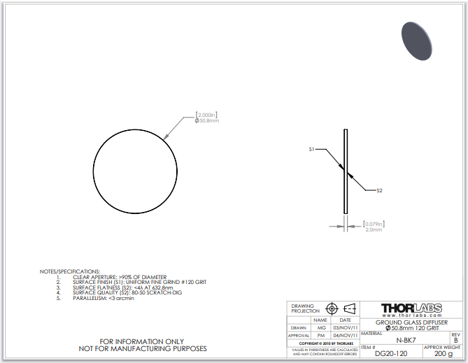 Thorlabs索雷博 DG20-120 - N-BK7磨砂玻璃散射片