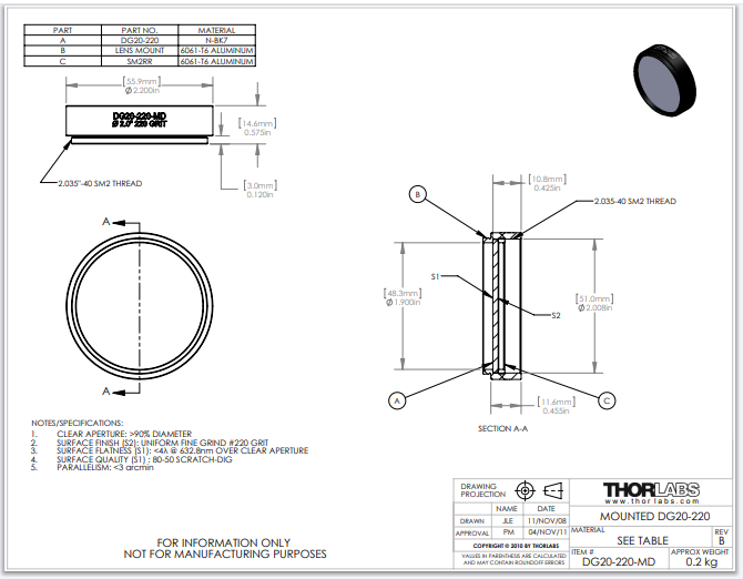Thorlabs索雷博     DG20-220-MD - SM2螺纹安装,N-BK7磨砂玻璃散射片