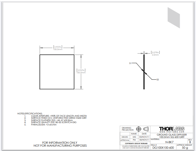 Thorlabs索雷博 DG100X100-600 - N-BK7磨砂玻璃散射片