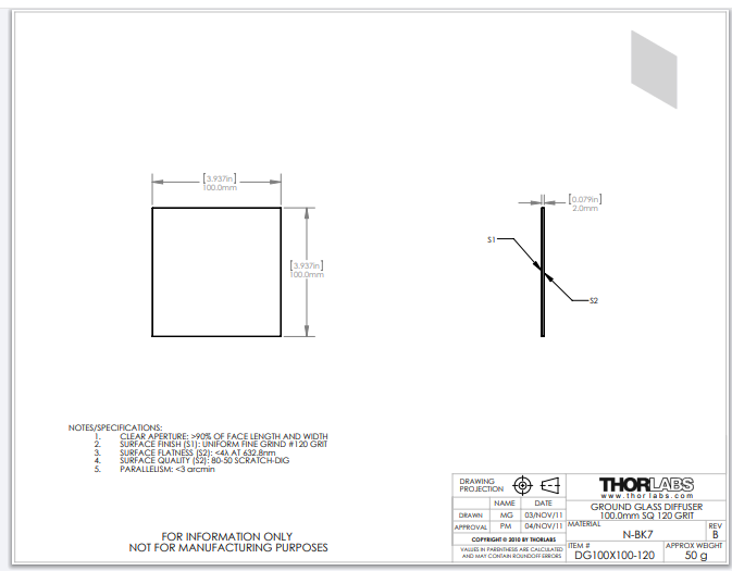 Thorlabs索雷博 DG100X100-120 - N-BK7磨砂玻璃散射片