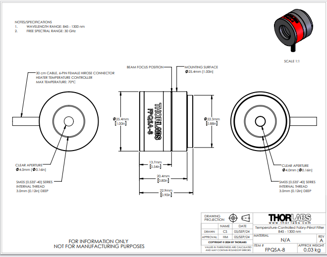 Thorlabs索雷博     FPQSA-8 - 法布里-珀罗滤光器