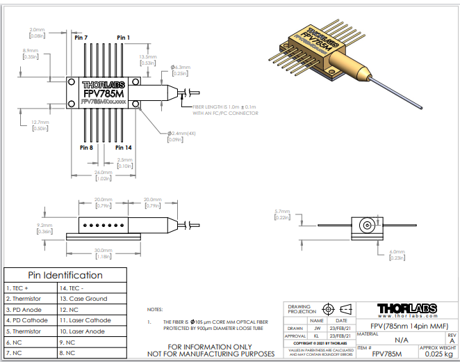 Thorlabs索雷博 FPV785M - 体全息光栅波长稳定型激光二极管