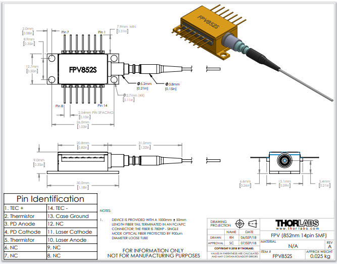 Thorlabs索雷博     FPV852S - 单频激光二极管