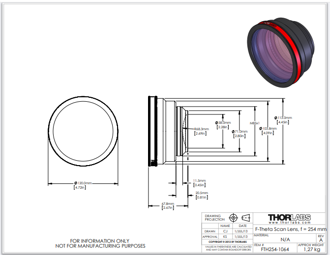 Thorlabs索雷博 FTH254-1064 - F-Theta扫描透镜
