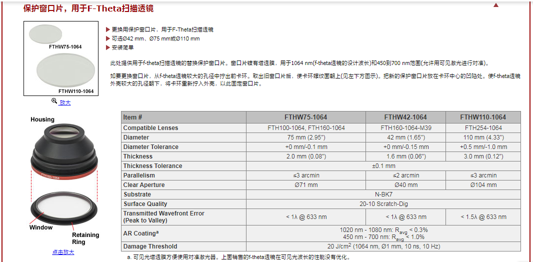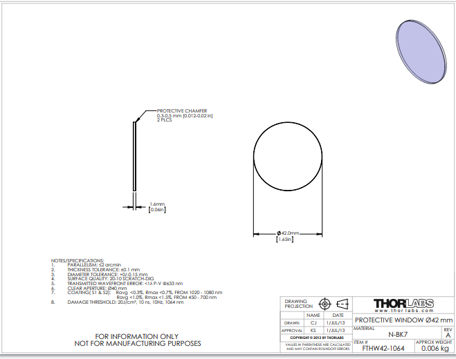 Thorlabs索雷博 FTHW42-1064 - 保护窗口片