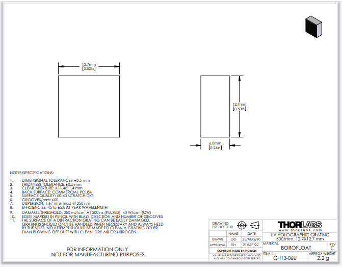 Thorlabs索雷博 GH13-06U - UV反射式全息光栅