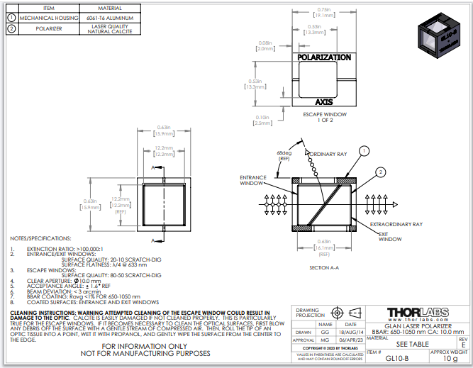 Thorlabs索雷博 GL10-B - 格兰-激光偏振器