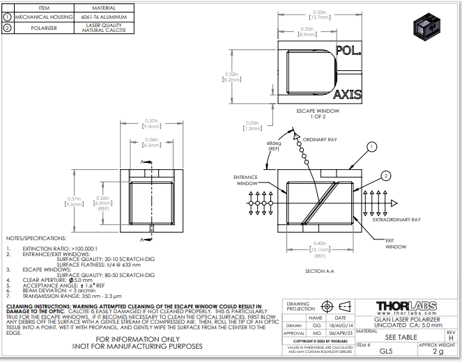 Thorlabs索雷博 GL5 - 格兰-激光偏振器