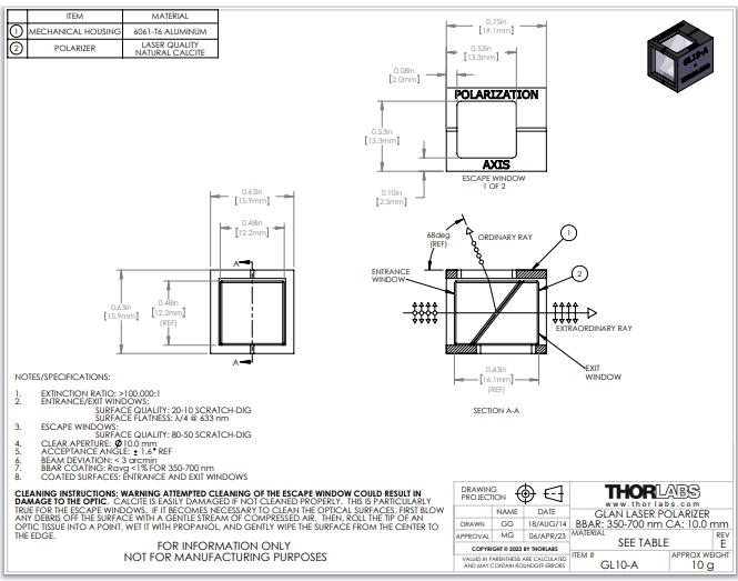 Thorlabs索雷博     GL10-A - 格兰-激光偏振器