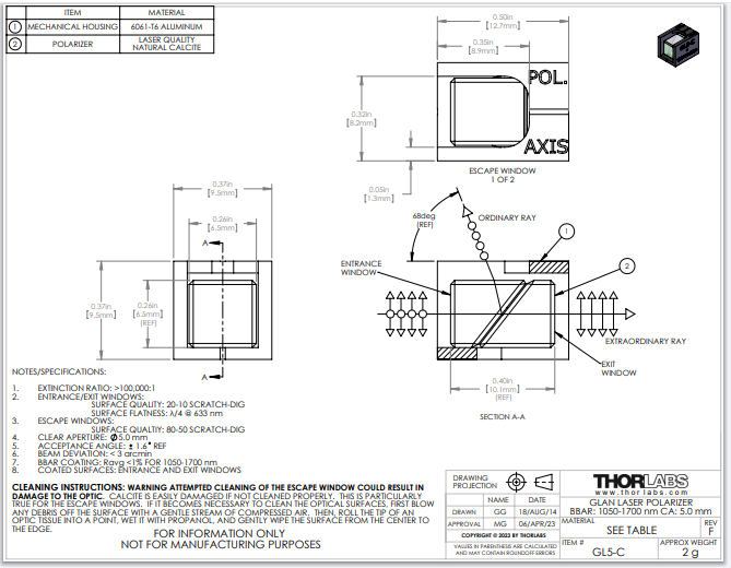 Thorlabs索雷博 GL5-C - 格兰-激光偏振器