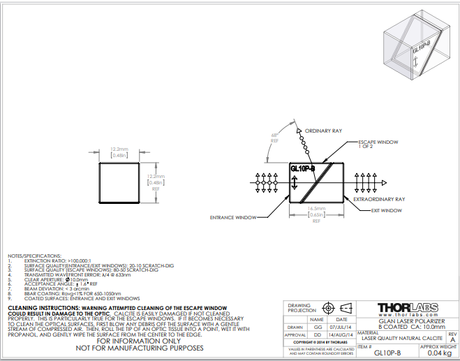 Thorlabs索雷博 GL10P-B - 格兰-激光偏振器