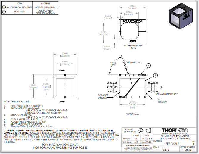 Thorlabs索雷博     GL15 - 格兰-激光偏振器