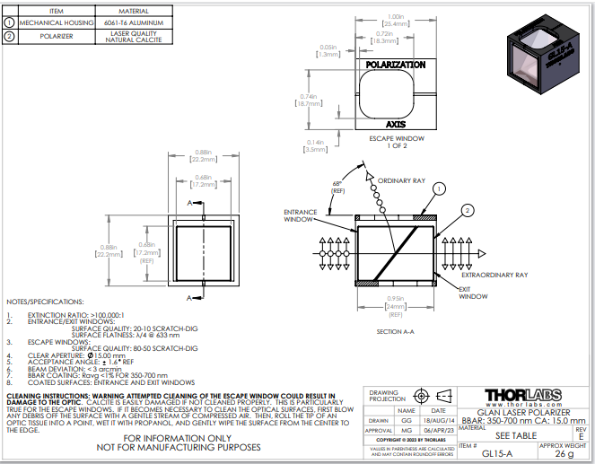 Thorlabs索雷博     GL15-A - 格兰-激光偏振器