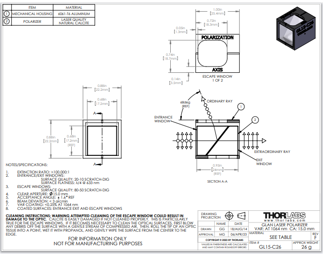 Thorlabs索雷博     GL15-C26 - 格兰-激光偏振器