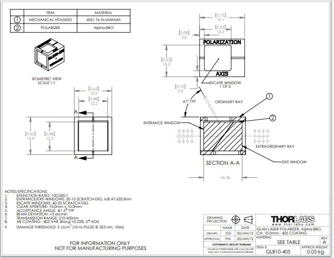 Thorlabs索雷博 GLB10-405 - 格兰激光α-BBO偏振棱镜