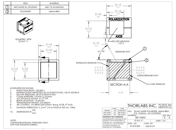 Thorlabs索雷博 GLB10-UV - 格兰激光α-BBO偏振棱镜