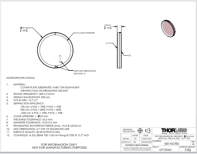 Thorlabs索雷博 GP1006M - 体相位全息透射光栅