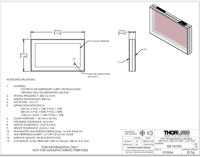 Thorlabs索雷博 GP3506L - 体相位全息透射光栅